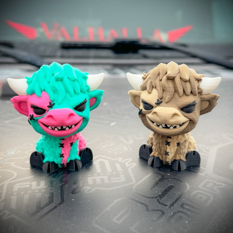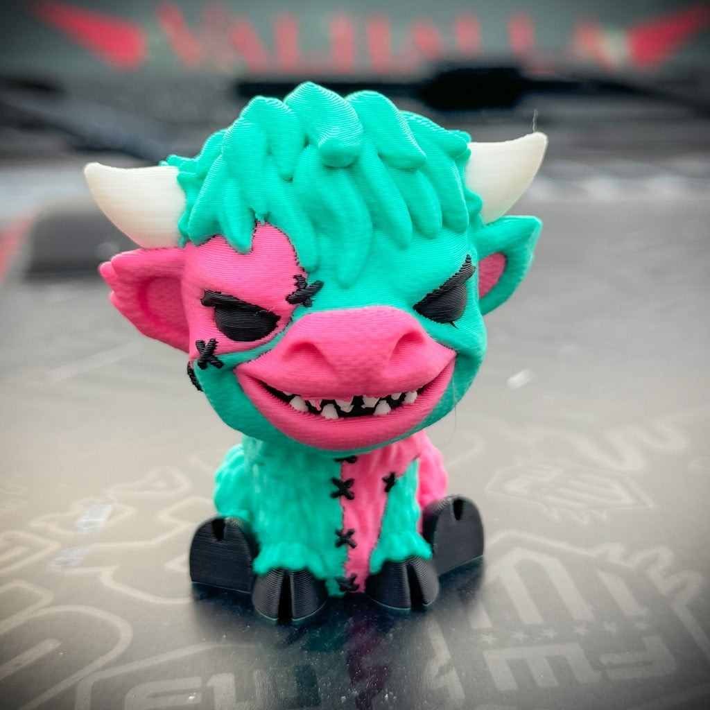Meet Patches, the baby Highland Cow gone rogue. Once sweet and innocent, now stitched, scarred, and mad at the world. This isn’t your average cute collectible — this one’s got an edge.